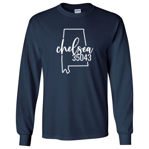 Gildan Brand Chelsea Zip Code 35043 With Big State Outline. We can do any city/zip code, just let us know! Please email us at ShirtsBySandra@gmail.com if you are interested in a color or shirt style that isn't shown.
